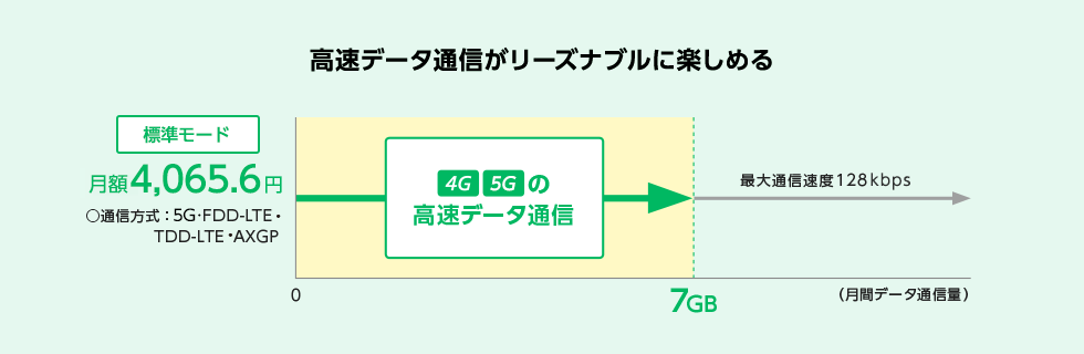 - ●当月ご利用のデータ通信量が7GBを超えた場合に、当月末までデータ通信速度の低速化(送受信時最大128kbps)を行います。