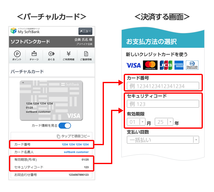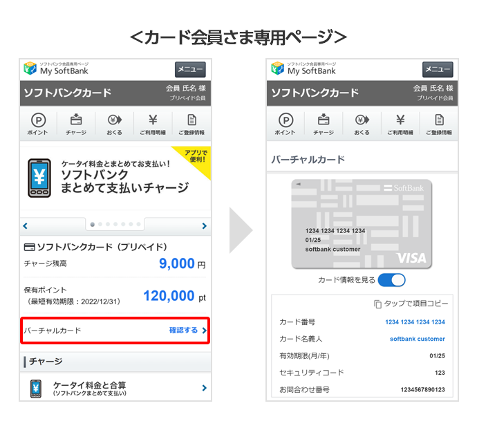 バーチャルカードは、ソフトバンクカード アプリまたは、ウェブ(My Y!mobileのカード会員さま専用ページ)からご確認いただけます。